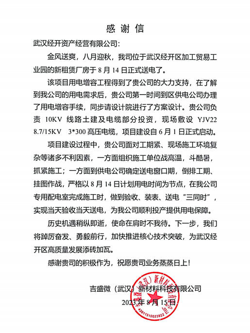 8月16日,吉盛微(武汉)新材料科技有限公司向资产公司发来了感谢信,对资产公司的鼎力支持表示衷心的感谢,同时也表示将踔厉奋发、勇毅前行,加快推进核心技术突破,为武汉经开区高质量发展添砖加瓦。