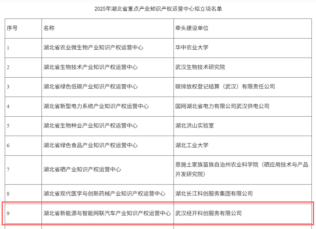 近日,湖北省知识产权局公布2025年省重点产业知识产权运营中心立项名单。由创服公司牵头申报的“湖北省新能源与智能网联汽车产业知识产权运营中心”成功入选,成为全省13家获批单位之一。