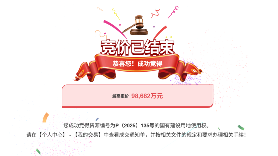 11月25日,经开产投集团下属公司武汉经开新程置业有限公司成功竞得武汉经济技术开发区郭徐岭13R2地块4宗住宅用地(供地号P(2025)135号、P(2025)136号、P(2025)137号、P(2025)138号)。