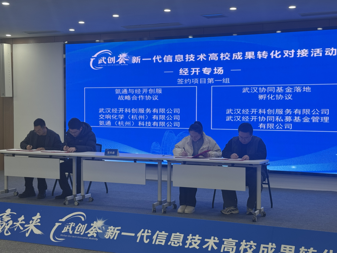 本次活动由武汉市科技成果转化促进中心、武汉经开区科技创新局主办,创服公司承办。签约环节中,创服公司与氨通(杭州)科技有限公司签署战略合作协议,双方将依托国科大杭州高等研究院科研优势,在军山双智基地推进低温低压脉冲催化合成氨技术转化与产业化,该项目是新能源与数字化学交叉领域的前沿探索。此外,现场还签署了基金孵化、产业落地等4项合作。