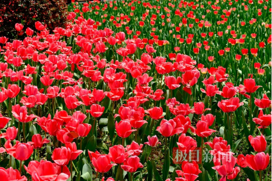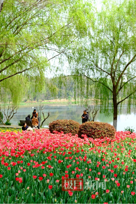 3月25日,极目新闻记者在武汉经开区汤湖公园看到,红色、黄色、粉色等多种颜色的郁金香盛开,吸引不少市民游客前来打卡拍照。
