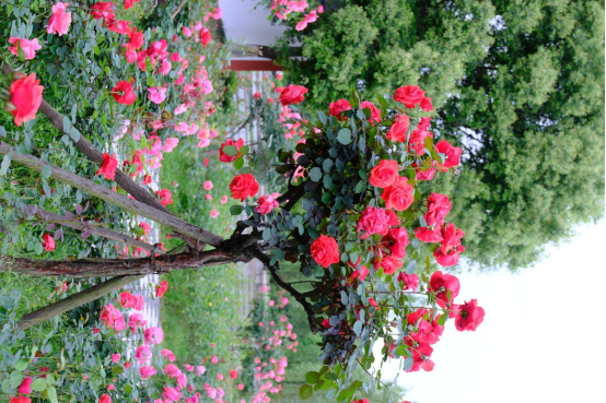 记者步入公园东区月季园,瞬间被眼前景象震撼,最吸睛的当属树状月季花伞区: 碗口粗的枝干上,直径近一米的硕大花冠层层叠叠,红的炽热、粉的娇嫩、黄的明媚、白的纯净。阳光穿透花瓣,仿佛为它们镀上了一层流动的光晕。公园里,不少市民游客驻足花海,或仰头欣赏,或倚靠回廊,轻松拍出“大片”。
