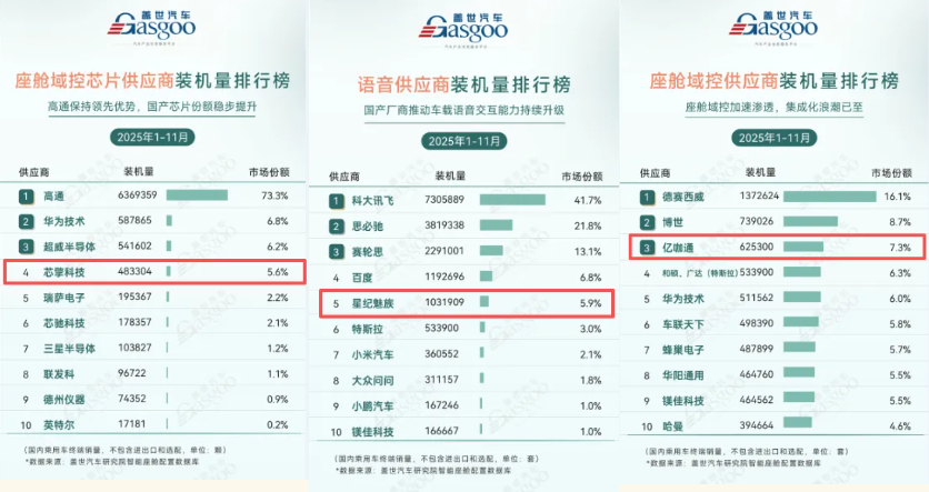 近日,盖世汽车发布2025年度1-11月汽车智能部件供应商国内乘用车装机量排行多项榜单,经开产投集团金融板块投资的亿咖通、芯擎科技、星纪魅族分别位居座舱域控、座舱域控芯片、车载语音交互领域3项榜单的前列。